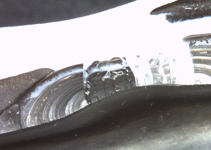 最後に画面上半分の眩しいところは今回破断した箇所ですね。ということはごく最近はクリップのこの断面は本来の半分くらいの面積で荷重を支えていたということになりますか。確かに亀裂が入っていることは割れる前から見えていましたから、割れるのは時間の問題だったのでしょう。