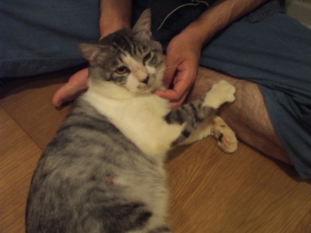 土日は実家に帰省していました。その実家にて、 初対面、というわけではありませんが、先日飼い猫になったぶっち氏(男性)に会う。