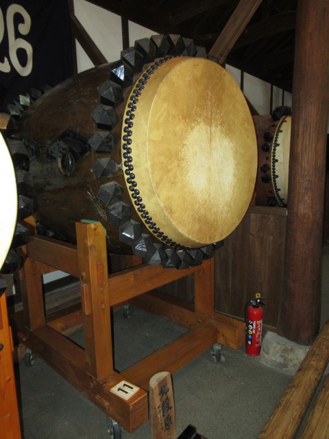 床に寝ているのはどら太鼓、台に載っているのは長胴太鼓。消火器と見比べればわかりますが、迫力ありますよ。