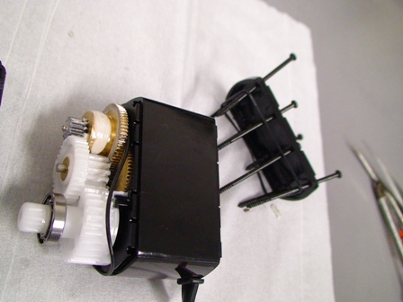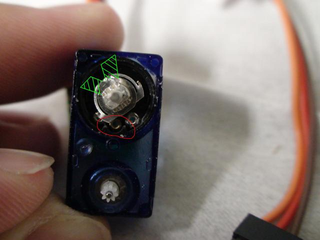 まずRB50。ケースを開けてギヤをとったら、写真の緑色の形のアルミを切り取ります。その部分が写真の赤いところとぶつかって回り止めになっているので。なお、このサーボのポテンショメータは回り止めさえ除去すれば無限回転するのであとは世話無しです。