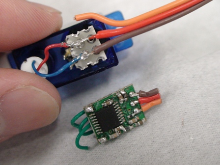 配線も変更。ドライバ基盤ははずしちゃっておっけー。中に代わりの基盤を入れてるのは、外から線を引っ張った時にモータ側に直に力が伝わらないようにするためです。