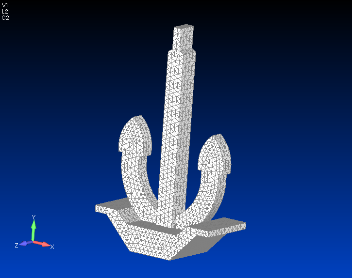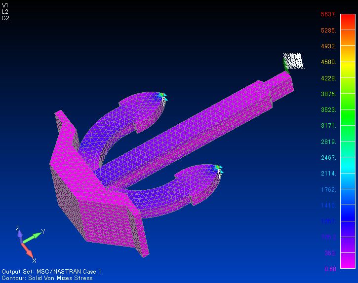 なんて,大きな口をたたきましたが,1時間かそこらで描いた超適当なモデルです.WEBで見つけたJIS A型ストックレスアンカー(ホールスアンカー)の図をDXFにコンバートして,2次元CAD上で適当に輪郭を描き,FEMのプリポストに渡してサーフェスを押し出したという,それだけのもの.お叱りを受けそうですが,角のフィレットすらありません.ただし寸法だけは実寸に近い.(←そこは大して重要ではない)