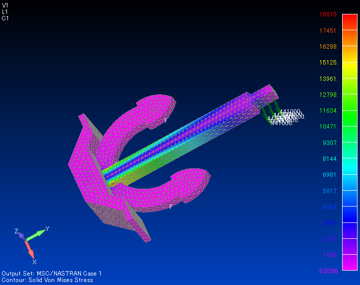 角にRがないので応力集中し放題だったんですが,実は最大に近い応力が現れているのが角(シャンクの付け根)そのものではなく,ちょっと先端側にずれているのが不思議といえば不思議.